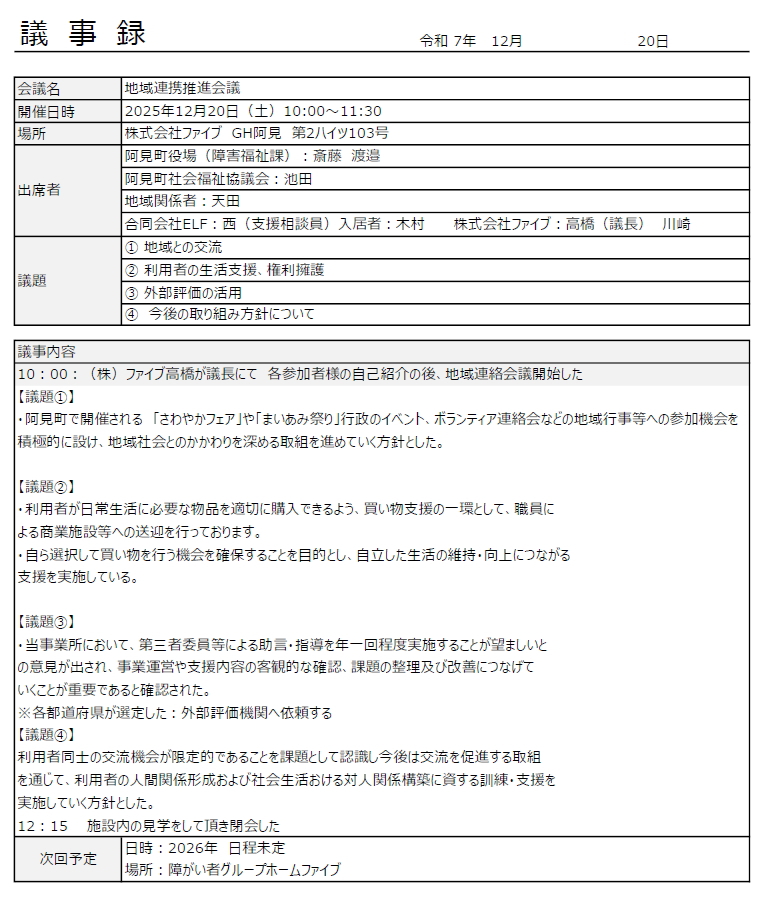 株式会社ファイブ(以下「当社」といいます)は、障がい者グループホーム事業を運営するにあたり、利用者様・ご家族様・お取引先様などの個人情報を適切に保護し、安心してご利用いただけるよう、以下の方針に基づき個人情報の保護に努めます。